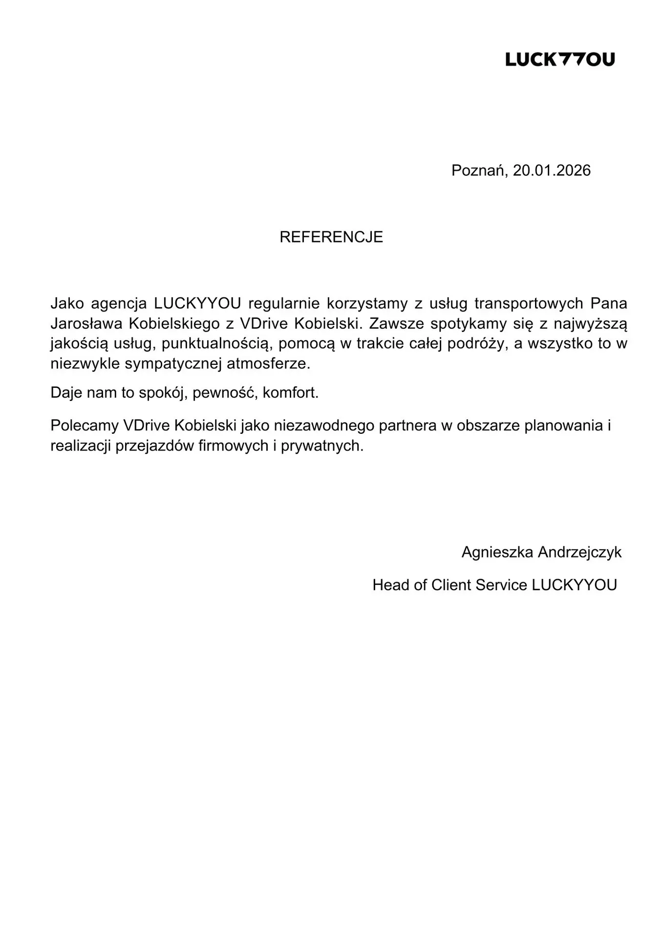 Takie referencje są dla nas potwierdzeniem, że konsekwentnie realizujemy nasz cel – aby każdy przewóz spełniał standard premium. Dzięki poleceniom naszych Partnerów nieustannie podnosimy jakość usług i dbamy, by każda podróż była synonimem profesjonalizmu, niezawodności i komfortu.